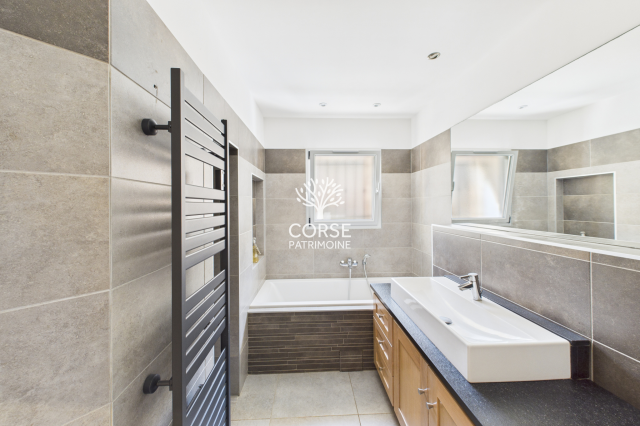 Très belle villa récente située aux portes de Porto-vecchio et disposant d'un environnement calme avec une vue mer et montagne. A votre disposition en rez de chaussée un ensemble avec un salon séjour, une cuisine entièrement aménagée et équipée, une arrière cuisine, quatre chambres dont une avec salle d'eau privative, une salle de bains avec douche, un WC séparé. En rez de jardin un vaste appartement indépendant de type T3 avec salon, cuisine aménagée ouverte, deux belles chambres chacune avec salle d'eau privative. Chaque étage dispose de ses propres terrasses pour partie couvertes avec vue mer et montagne. Un espace piscine avec coin jacuzzy est également à votre disposition. L'ensemble à cinq minutes du centre ville de Porto-Vecchio et des plages de Santa Giulia, sur un terrain arboré et au calme de 2279 m2. Panneaux solaires récemment installés.